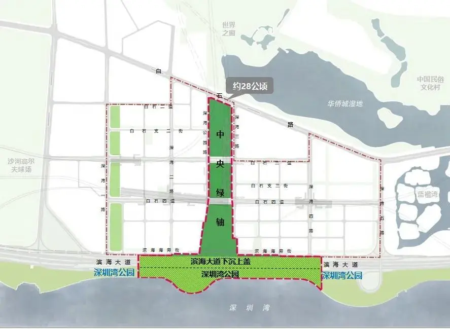 今年6月6日上午,该基地举行中央绿轴项目开工活动,此次开工的中央绿轴项目南北全长约1.0公里,最大宽度达210米,是连接塘朗山——华侨城湿地——深圳湾“通山达海”的核心空间轴线。随着滨海大道深超总段下沉工程建设,未来深超总红线内景观将与深圳湾公园无缝衔接,共同构成南北贯通的中央绿轴体系。