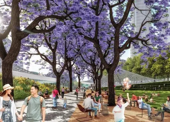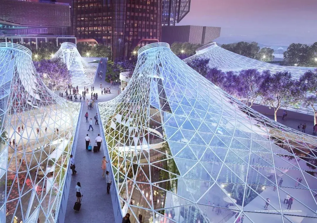 为车站广场,“水晶山丘”屋面覆盖着地下车站枢纽大厅,同时也在地面创造出造型独特的城市地标。光影和夜景效果与交叉的蓝花楹大道配合,打造一个极具设计感的交通集散空间。地下共享大厅、地下森林与地面广场、周边建筑建立视觉联系,成为中央绿轴美景的一部分。