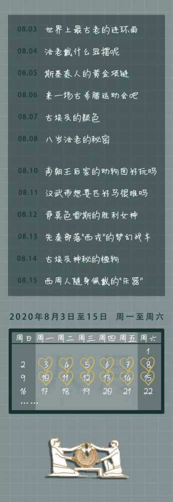 小小博物家,这个夏天我们从古埃及到古中国,为汉武帝寻马,拜访八岁的埃及法老,追寻最古老的连环画……与传统课堂不同,小小博物家十二讲,营造充满互动性的“沉浸式”课堂。