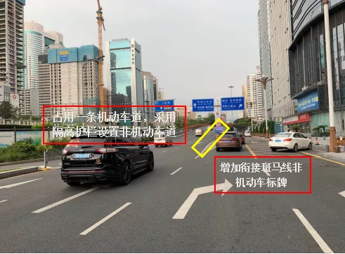 下一步,市交通运输局罗湖管理局将考虑在深南路新秀跨线桥、彩虹桥、文锦北路太白路口地下通道和望桐路华英学校路段等道路,将和平桥路跨线桥整治经验应用于以上路段的机非混行改善工作当中,整体看一下高架“非机”设置前后的区别。