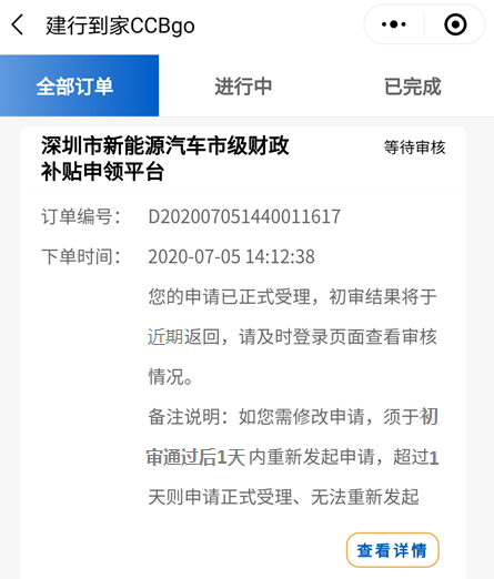 客户完成补贴申请提交后,平台将进行首次初审,初审结果将于近期返回并通过短信方式告知客户。届时,客户可通过登录“建行到家CCBgo-我的-我的申请”查看审核进展。