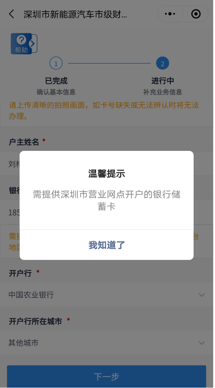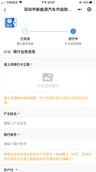 客户需上传银行卡照片,并填写银行账号、开户行信息。开户行如不在选项范围内可选择“其他”自填。其中,银行账号需为深圳市营业网点开户的银行一类储蓄卡,华侨、港澳台地区居民及外国人需提供深圳市建设银行一类储蓄卡。