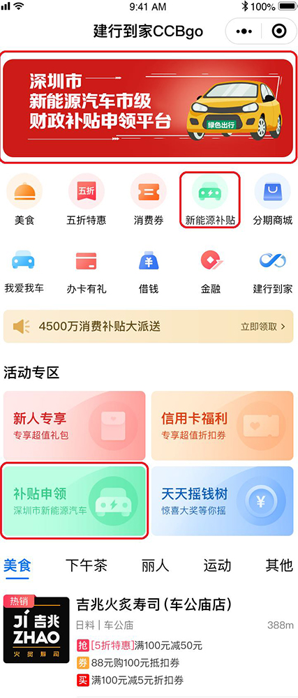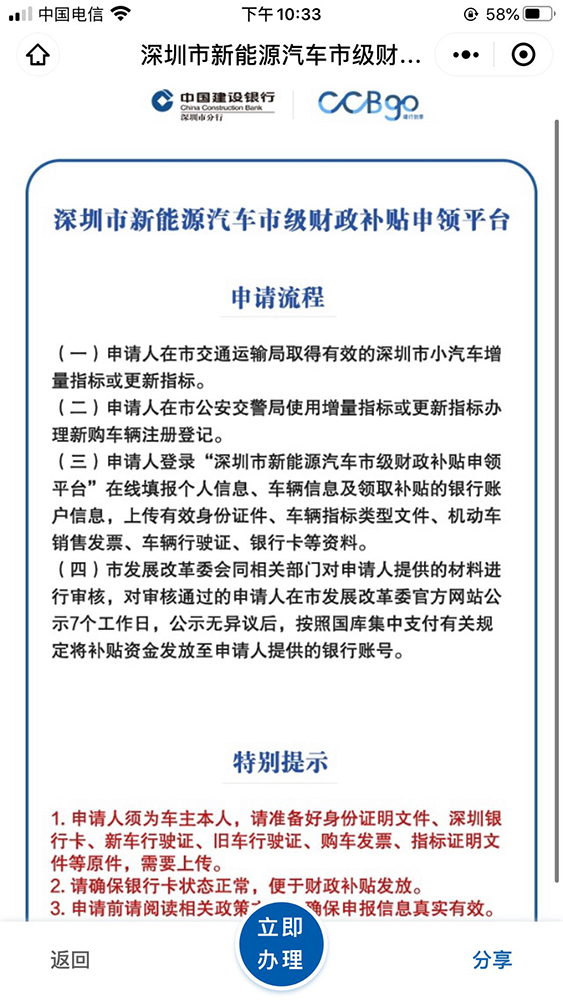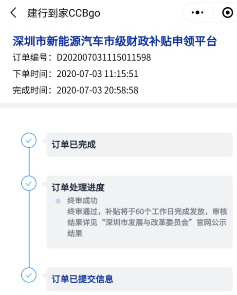 客户可通过i深圳微信公众号、深圳市发展和改革委员会官方网站或微信公众号、深圳交警微信公众号或建行到家CCBgo小程序登录“深圳市新能源汽车市级财政补贴申领”平台。