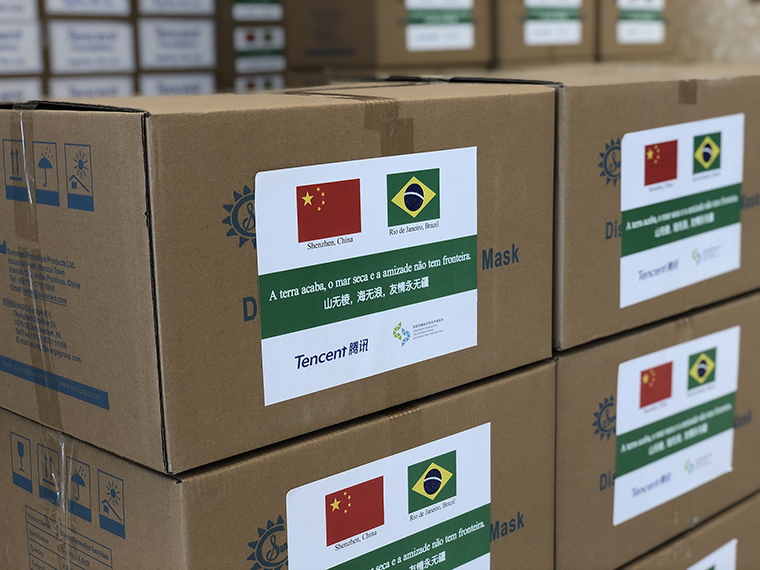 为支持国际抗疫合作,在深圳市委外办指导支持下,腾讯公司联合深圳市国际交流合作基金会(以下简称“基金会”),向巴西里约热内卢市捐赠20万个口罩,其中包含10万个一次性医用口罩和10万个KN95口罩。7月14日上午,抗疫物资捐赠仪式在福田区NEO企业大厦举行。
