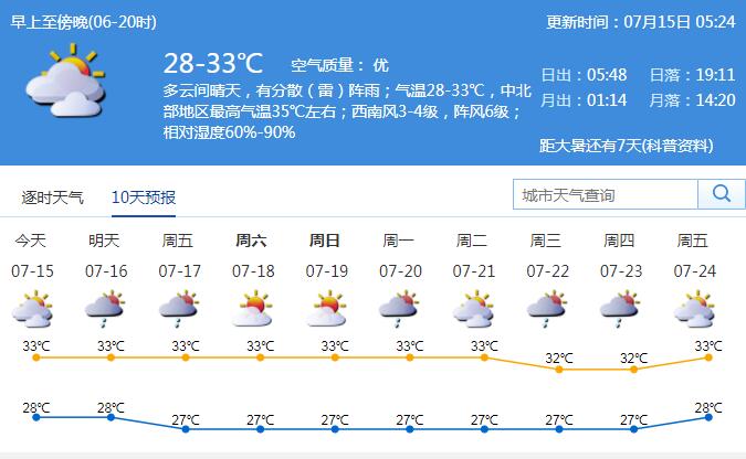 见圳客户端·深圳新闻网2020年7月15日讯 15日多云间晴天,有分散(雷)阵雨;气温28-33℃,中北部地区最高气温35℃左右;西南风3-4级,阵风6级;相对湿度60%-90%。16-17日多云间晴天,间中有分散(雷)阵雨,最高气温34-35℃;18-20日闷热天气持续,局地偶有短时(雷)阵雨。高温黄色预警持续生效。