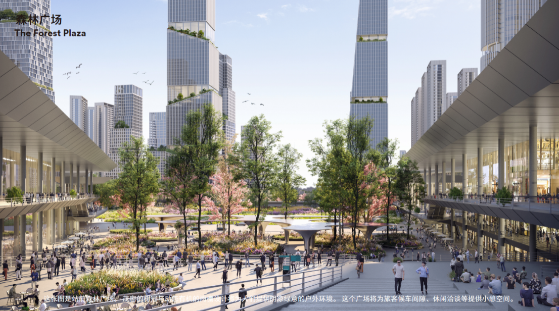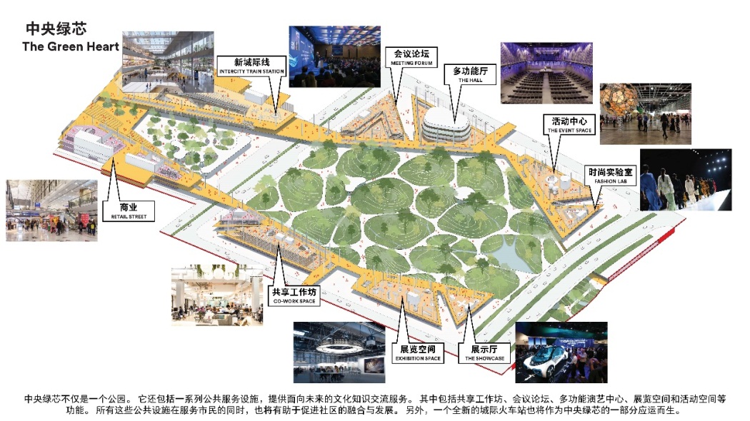 方案以独特的“绿链都芯”为理念,打造一个耦合生态、交通和公共生活的超级枢纽。设计的中央绿芯引入大面积森林和草甸,使人们在城市中重遇自然,让北站枢纽地区既拥有大城市商务中心区的特质,也拥有郊外自然的品质,形成全新的都市生活体验。同时,中央绿芯还包括会议论坛、多功能演艺中心等一系列公共服务设施,提供面向未来的文化知识交流服务。