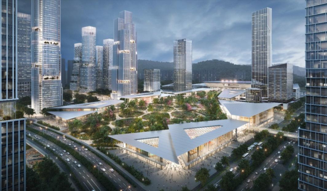 聚落肌理的创新交流坊环抱中央绿芯,设置公共服务、餐饮食肆等功能,通过通透的首层设计、大挑檐连廊打造,使人们在安享城市服务的同时,也能够欣赏优质的自然生态景观,形成一个融合生态、交通和公共生活的超级中枢。