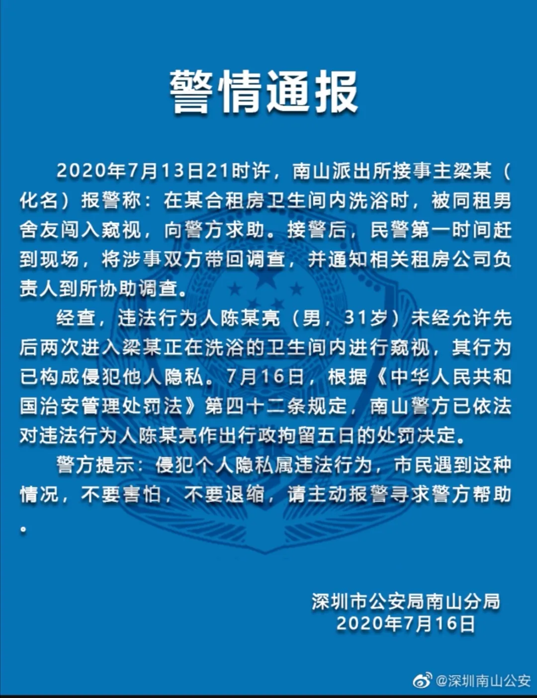 蛇口消息报2020年7月16日讯 7月16日,南山警方发布对“女生合租房卫生间洗浴被同租男舍友闯入”事件的警情通报,违法行为人陈某亮(男,31岁)行为已构成侵犯他人隐私,南山警方已依法对陈某亮作出行政拘留5日的处罚决定。