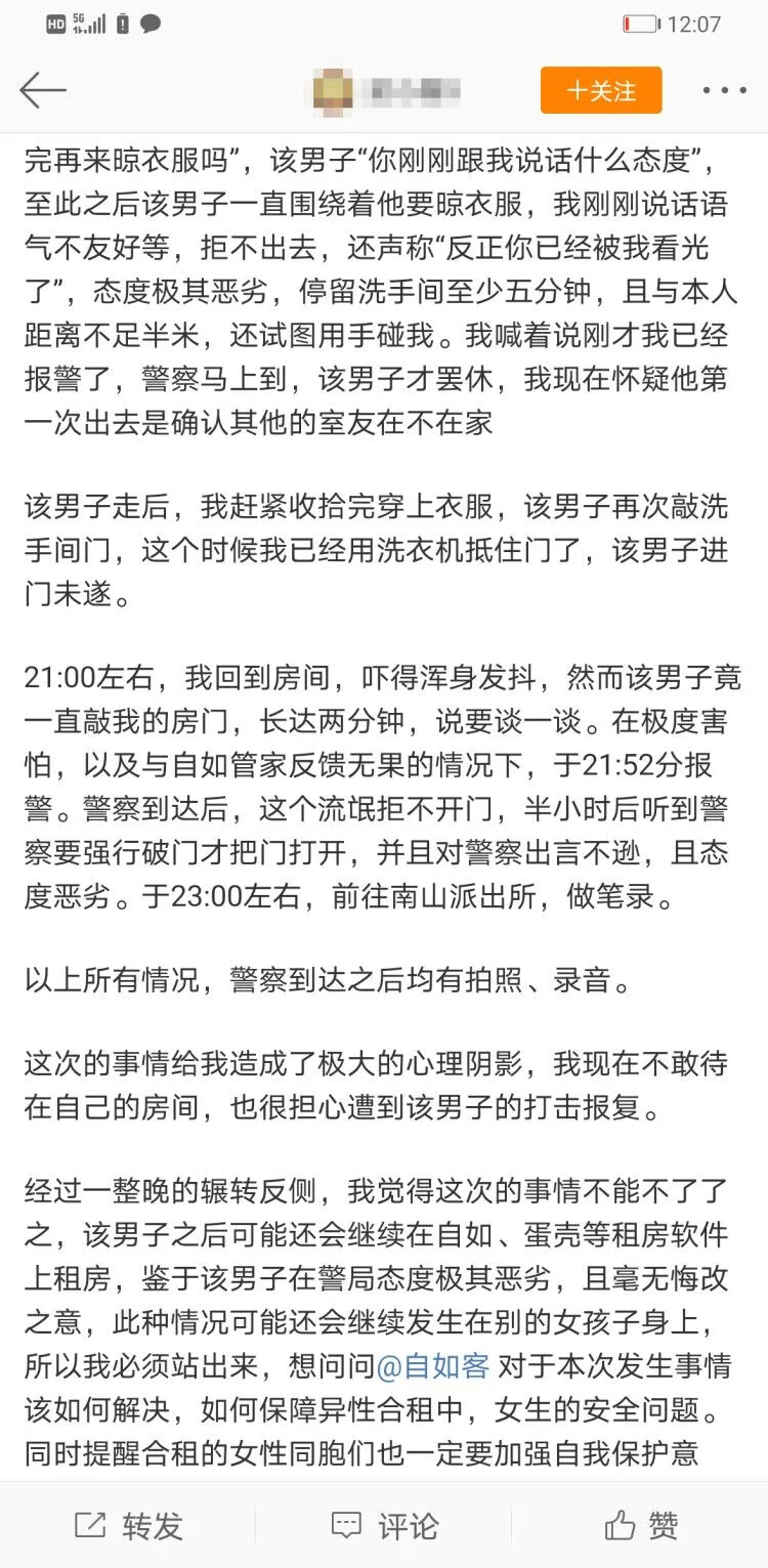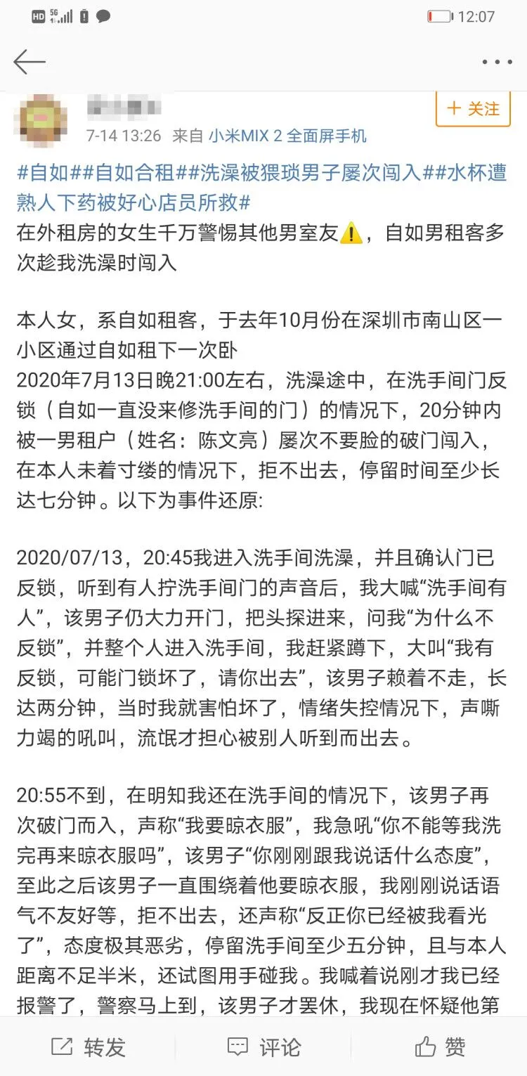 南山警方通报“女生合租房卫生间洗浴被同租男舍友闯入”事件结果