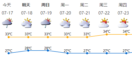我市多云,局部有短时(雷)阵雨;气温27-33℃,中北部地区最高气温34-35℃;南风3-4级,阵风6级;相对湿度60%-95%。