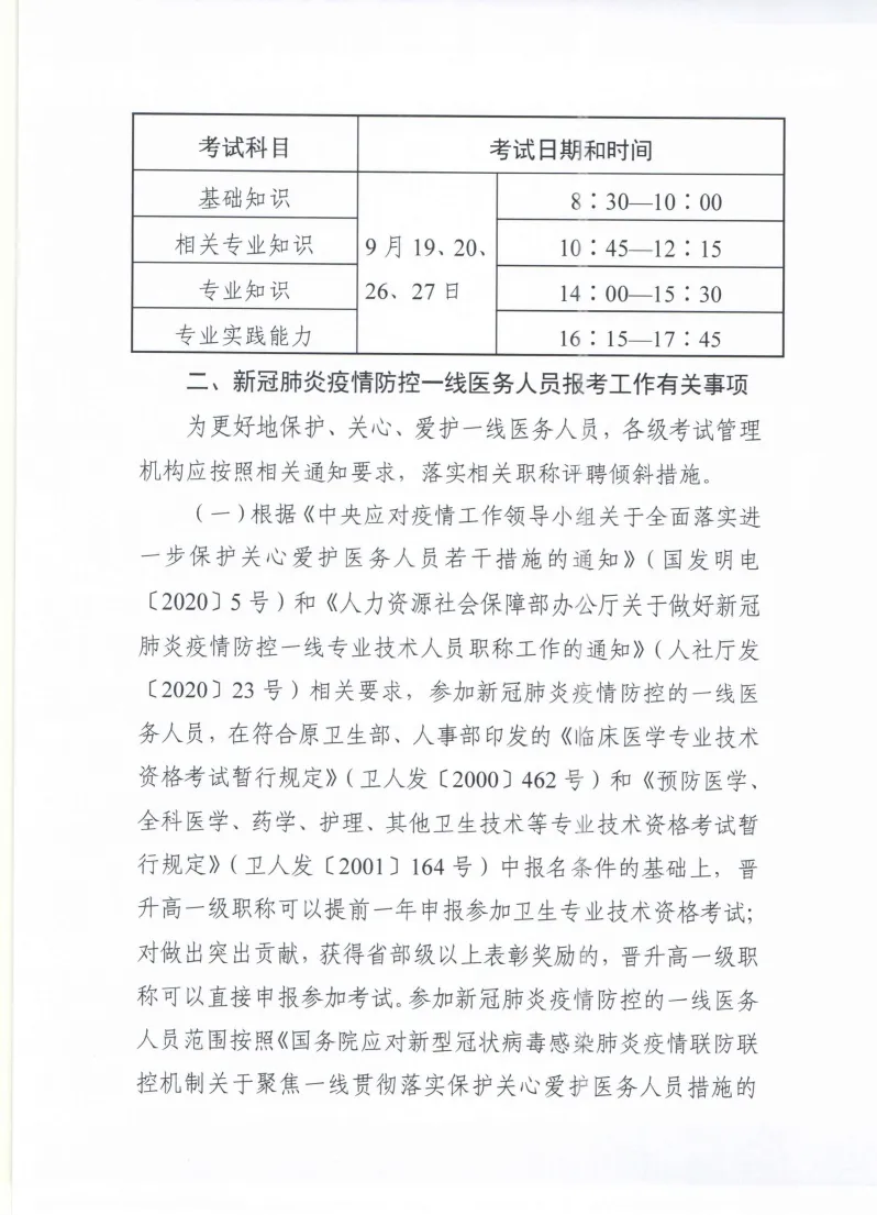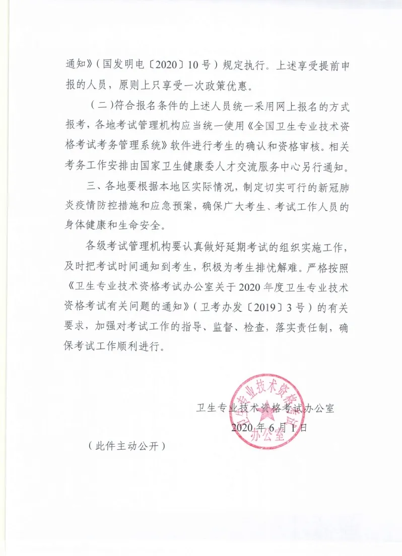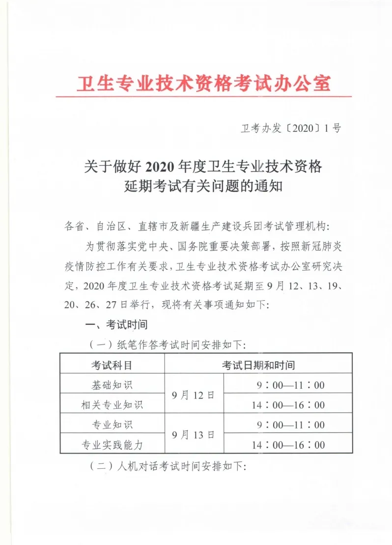6月1日,卫生专业技术资格考试办公室印发《关于做好2020年度卫生专业技术资格延期考试有关问题的通知》,2020年度卫生专业技术资格考试延期至9月12、13、19、20、26、27日举行。