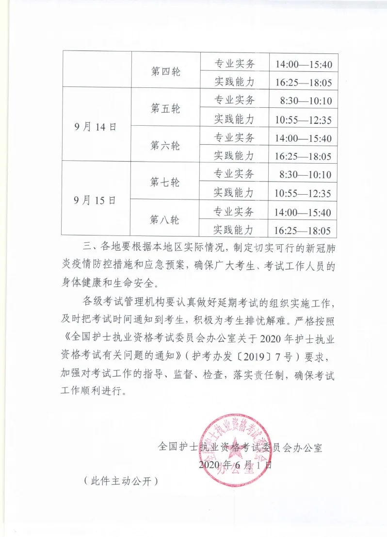 6月1日,全国护士执业资格考试委员会办公室印发《关于延期举行2020年护士执业资格考试的通知》,2020年护士执业资格考试延期至9月12日—15日举行。