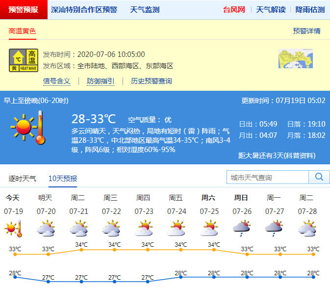 见圳客户端·深圳新闻网2020年7月19日讯 深圳市气象台预计,19-20日我市多云间晴天,局地有短时(雷)阵雨,气温28℃-33℃,中北部最高气温34℃-35℃;21-25日晴天到多云,局部偶有短时(雷)阵雨,闷热加剧。
