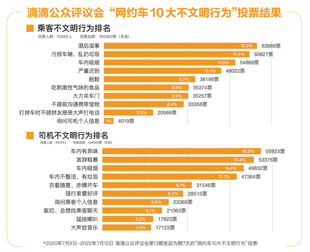 为进一步优化平台规则和治理方向,滴滴公众评议会第13期发起为期7天(7月6日至7月12日)的“网约车10大不文明行为”公众投票和意见征集。本次活动累计178216人次投票,收到4533条用户留言,用户分享了打车中遇到的遭遇,并积极献言献策。其中,共93092人次参与乘客不文明行为投票,共投出395483票,乘客酒后滋事以63989票高居“网约车10大不文明行为”榜首,污损车辆、乱扔垃圾获得60827票,车内吸烟54869票,排名第三。