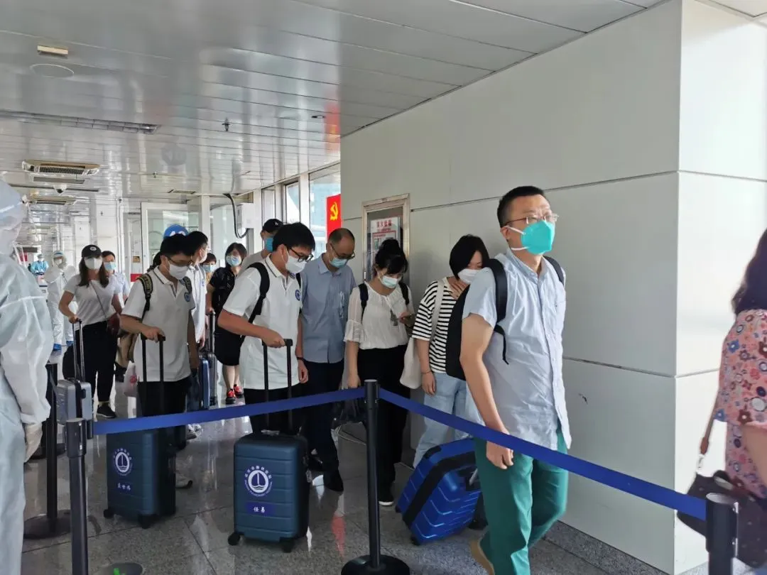 △来自武汉的核酸检测人员抵达新疆乌鲁木齐地窝堡国际机场。