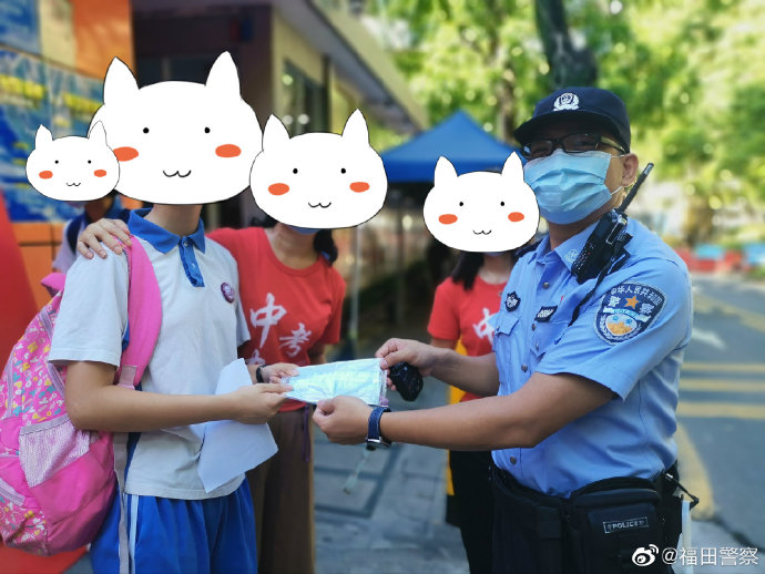 7月21日,深圳中考第二天,景田派出所社区民警一早就在各考场外为考生们保驾护航。当社区民警赵广生看见一名忘记佩戴口罩的考生时,立即取出身上的备用口罩递给她,使得考生顺利进入考场参加考试。福田警方温馨提醒:乘风破浪的同时,也要做到考试防疫两不忘。少年们,下午的考试继续加油吧!