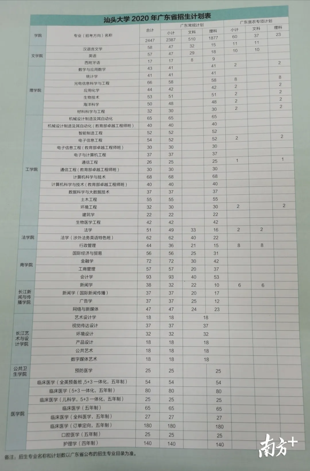汕大本科生招生计划数为3100人,新增预防医学、药学专业,分别招生30人、20人,并增加新闻学专业,新增国际新闻传播方向,招生45人。