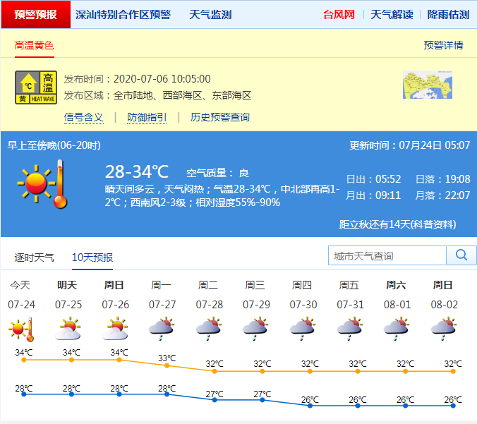 见圳客户端·深圳新闻网2020年7月24日讯(见圳客户端、深圳新闻网记者 陈婕 郑晓鹏)老天热“晴”不断,今明两天闷热加剧。24日晴天间多云,天气闷热;气温28-34℃,中北部再高1-2℃;偏南风3级;湿度55%-90%。25日晴天间多云,最高气温34-35℃,中北部可达36-37℃。26日持续晴热,局地有短时(雷)阵雨;27-29日多云,有短时(雷)阵雨;30日有阵雨或雷阵雨。