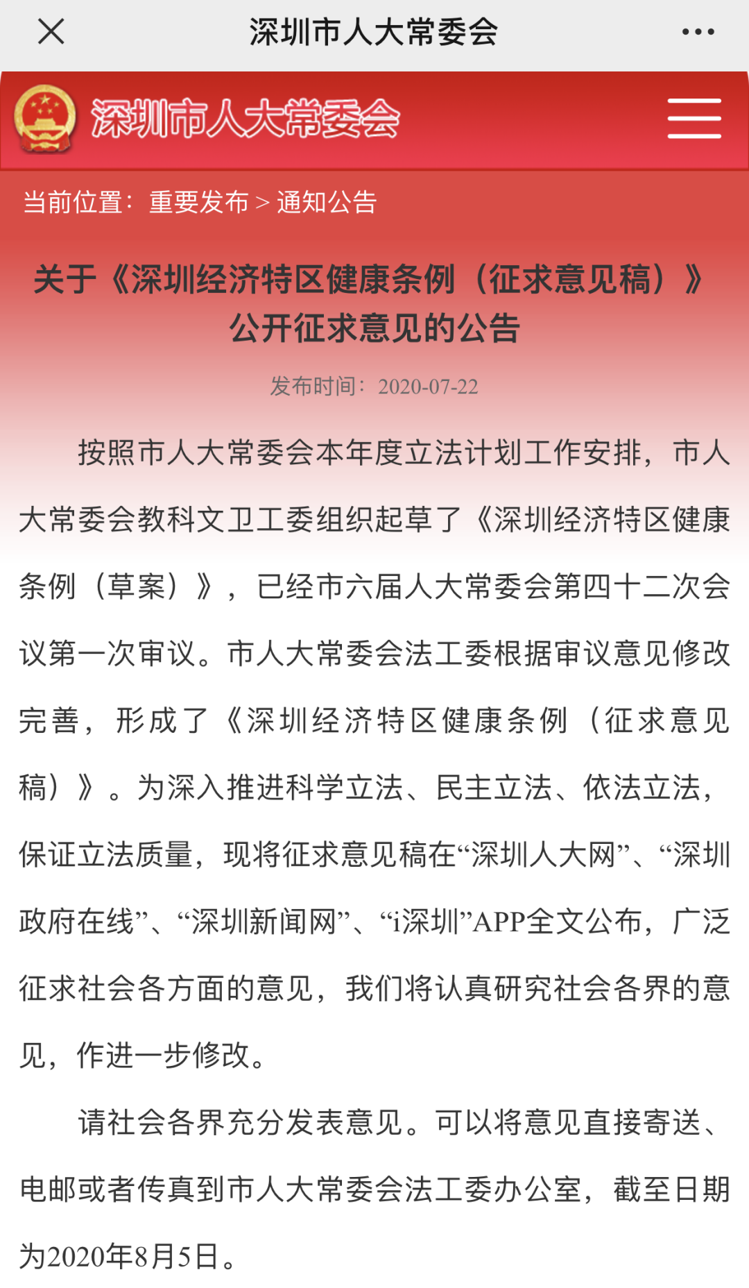 《征求意见稿》已在深圳人大网、深圳政府在线、深圳新闻网、“i深圳”APP全文公布,广泛征求社会各方面的意见。