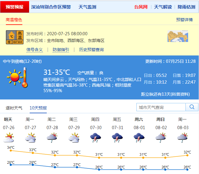 深圳市气象局预计今明两日深圳(含深汕)高温天气持续,最高气温可达34-36℃;27-31日转雷雨天气,高温天气略有缓解,其中27-28日多云,有短时(雷)阵雨;29-31日有雷阵雨。