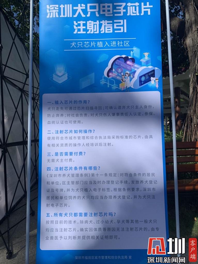 今年5月29日,在第二届深圳爱犬活动现场,深圳宣布全面启动为犬只植入电子芯片的工作,要求全市所有犬只必须注射芯片,芯片植入免费,到今年年底前实现系统登记犬只100%注射芯片。