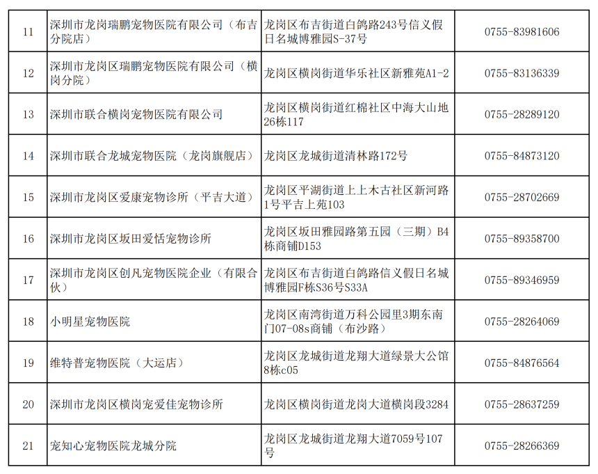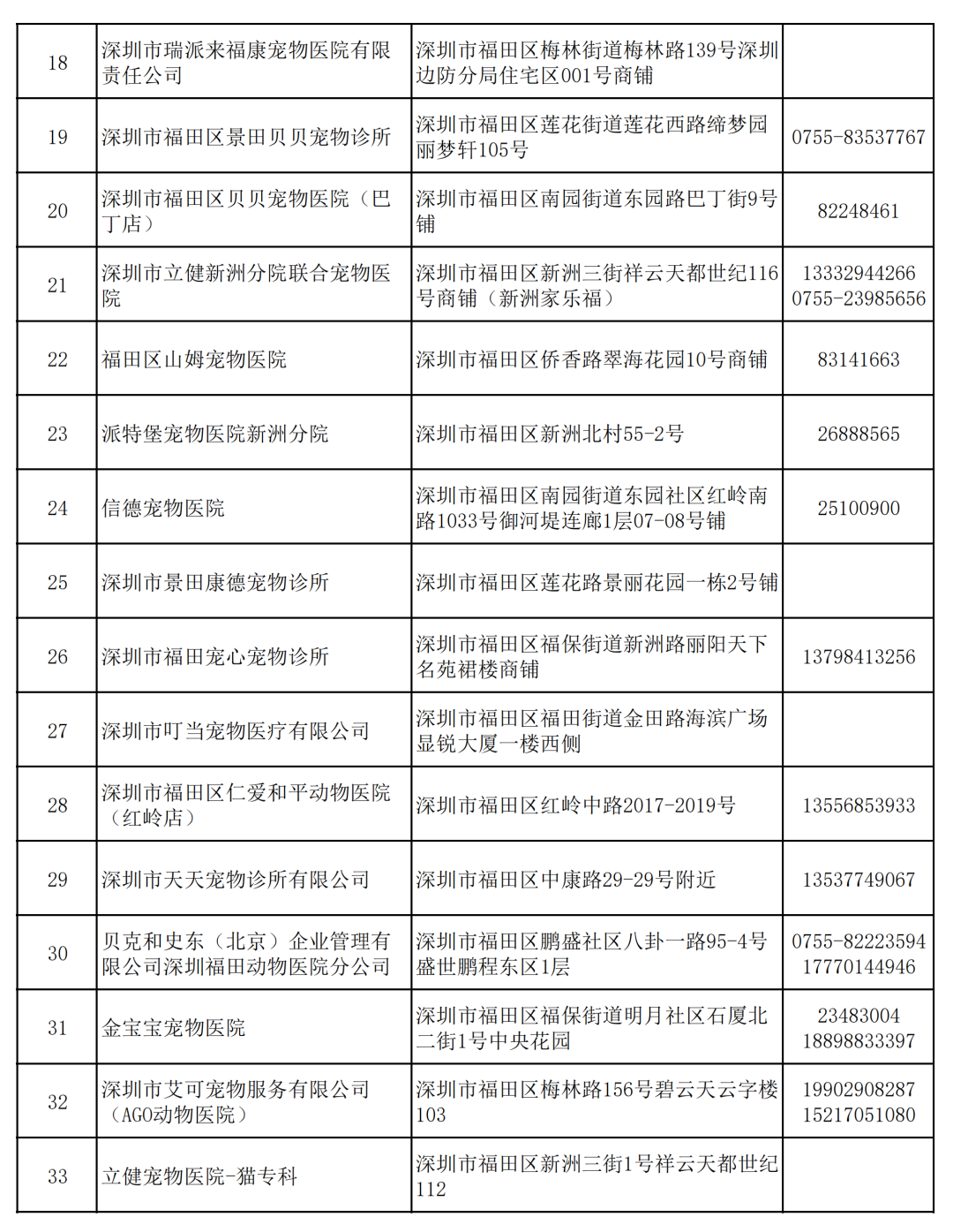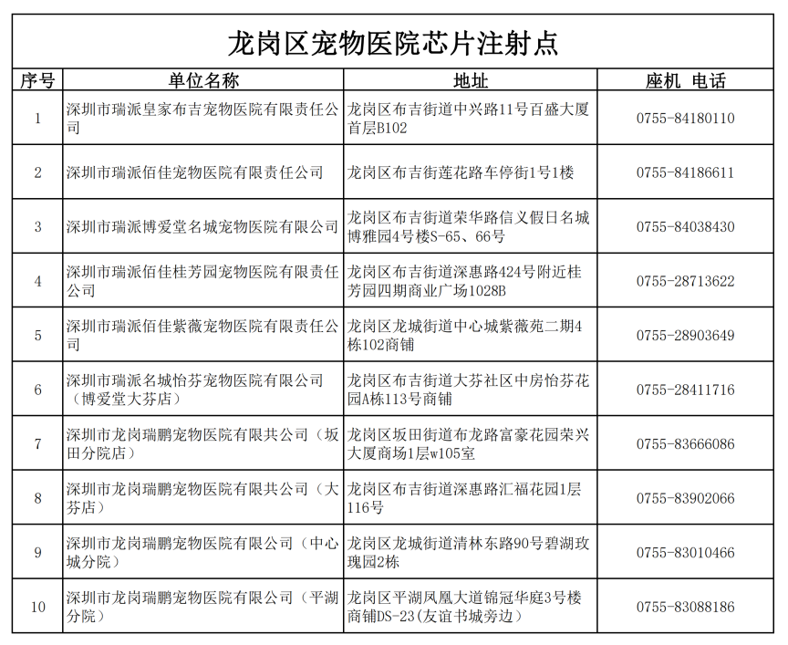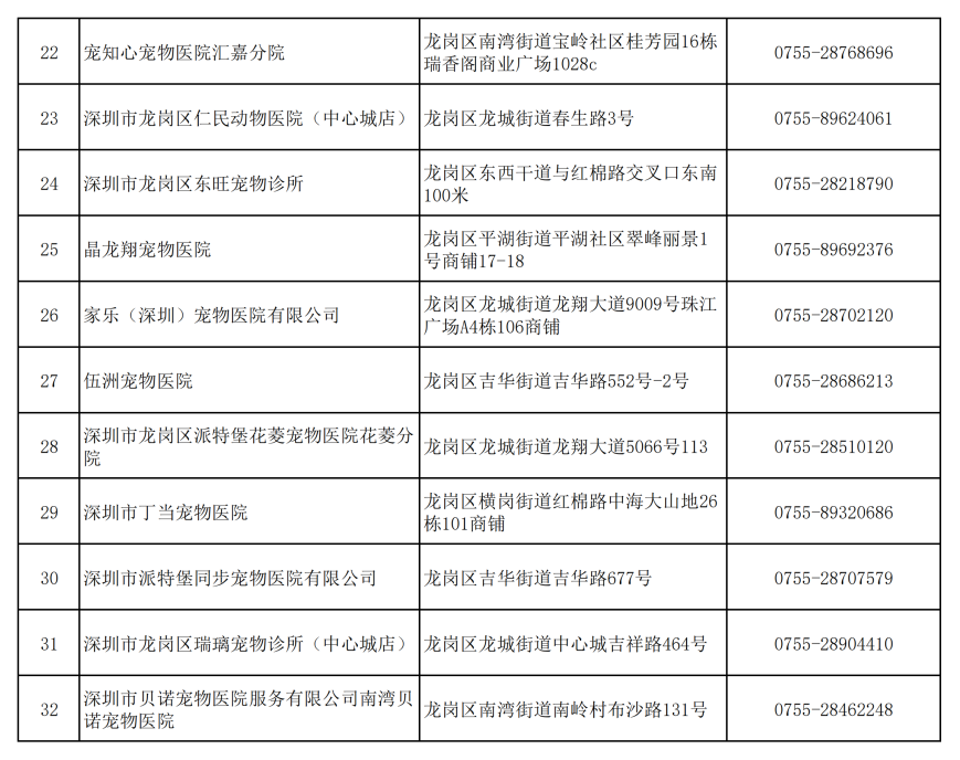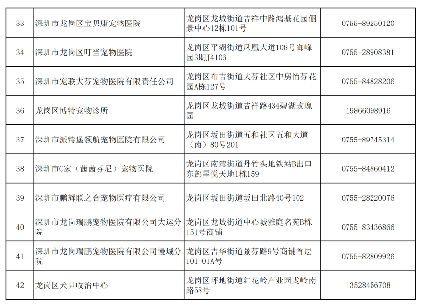 已与各区签订了《犬只芯片植入委托服务》的宠物医院信息。