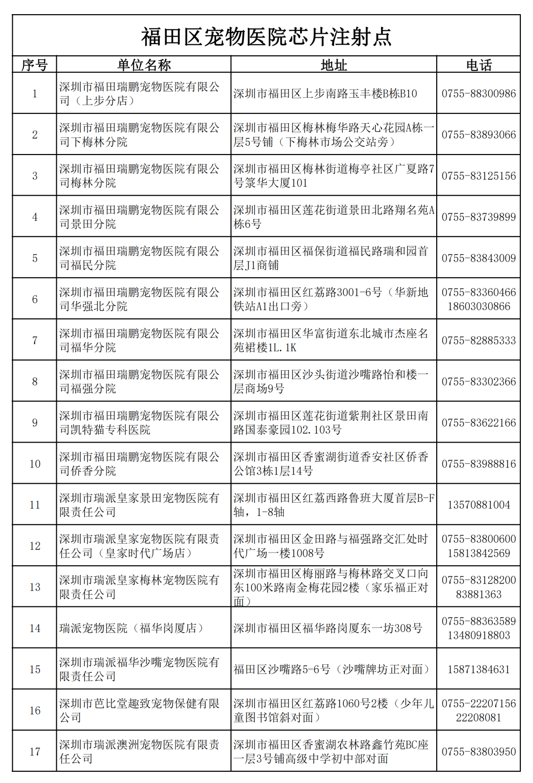 据福田区城市管理和综合执法局市容管理科副科长罗伟介绍,犬只芯片植入工作目前已在深圳市福田瑞鹏宠物医院梅林分院、瑞派皇家宠物医院时代广场店完成试点,随后将在全区33个宠物医院陆续开放芯片植入工作。