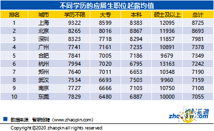上海、北京、深圳、广州这些一线城市的应届生平均起薪相对较高。一般而言,在各城市中,随着学历的提高,应届生起薪也会相应增加。但由于职业或行业的人才缺口较大,使得某些职位尽管学历不限或仅要求大专学历,但其薪酬却相对较高。例如,上海有的职位学历不限或要求大专以上,但起薪要高于本科岗位,这也间接反映出应届生就业市场存在明显的结构矛盾。