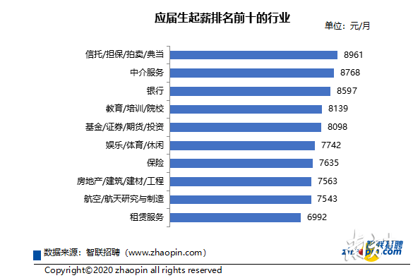 报告显示,应届生起薪排名前十的行业中,信托/担保/拍卖/典当、中介服务、银行等行业为起薪排名前三名,分别为8961元,8768元和8597元。除此之外,教育/培训/院校、娱乐/体育/休闲等受益于直播经济的带动和数字化的发展,也向应届生开出了相对高的薪酬。