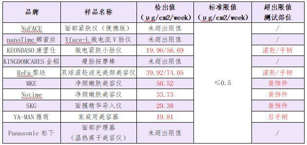 值得注意的是,在测试的10款家用美容仪样品中6款样品镍释放量测试结果不符合欧盟REACH法规要,包括KEONBASO康堡仕微电紧肤小脸仪、ReFa黎珐双球滚轮波光美颜美容仪、MKE净颜嫩肤美容仪、Notime净颜嫩肤美容仪、SKG面膜精华导入仪、YA-MAN雅萌家庭用美容器。