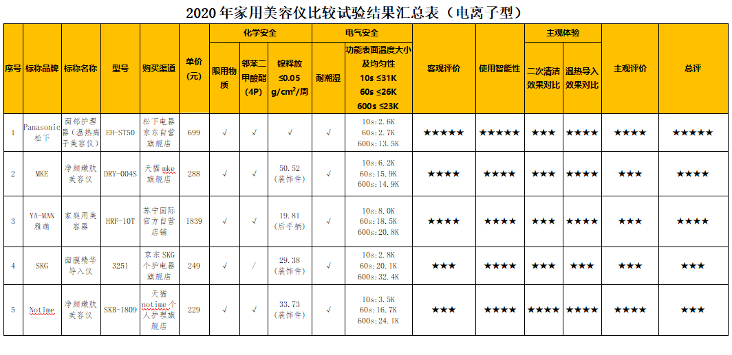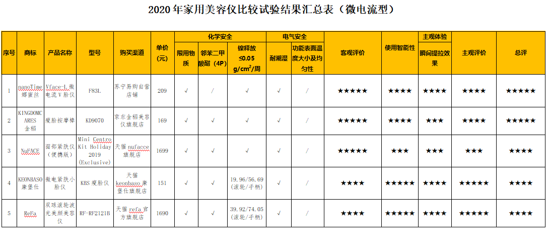 附:2020年家用美容仪比较试验结果汇总表(微电流型/电离子型)