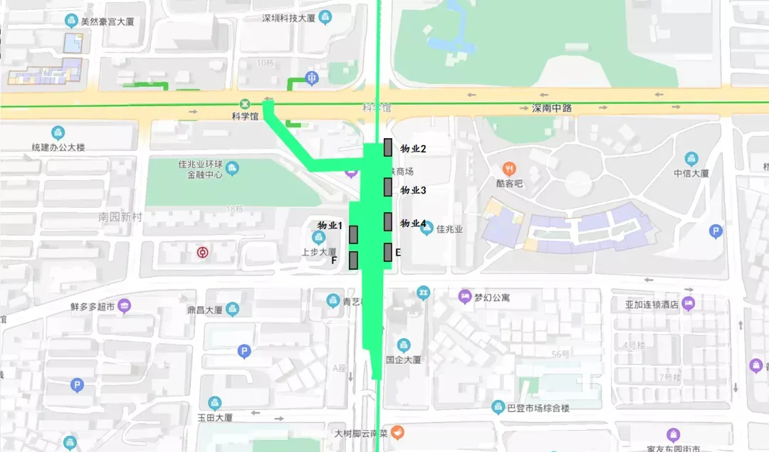 其中,E口位于上步路东侧并朝向南园路;物业1口位于物业层,靠近上步大厦;物业2口、物业3口位于物业层,靠近平安银行;F口位于上步路西侧并朝向南园路;物业4口位于物业层,靠近佳兆业大厦。