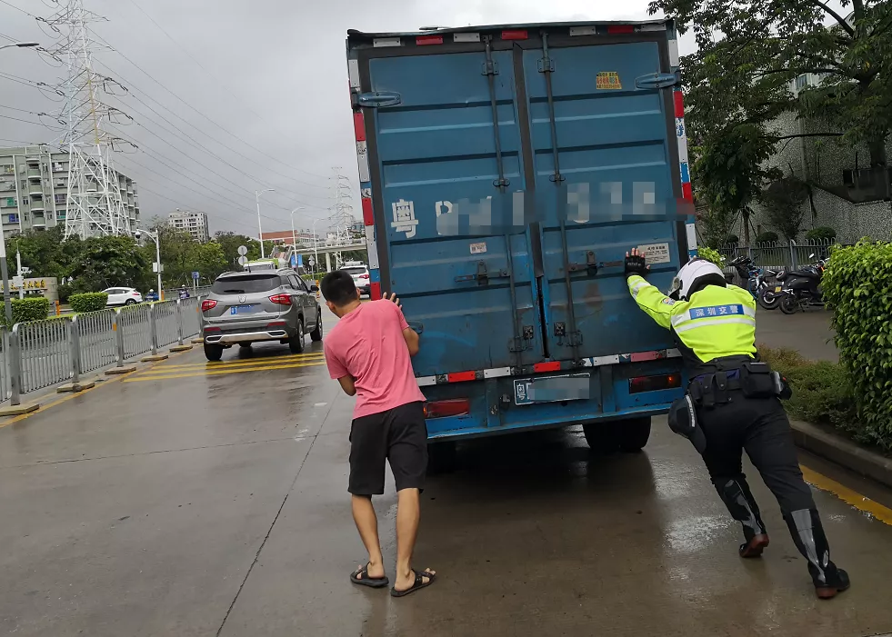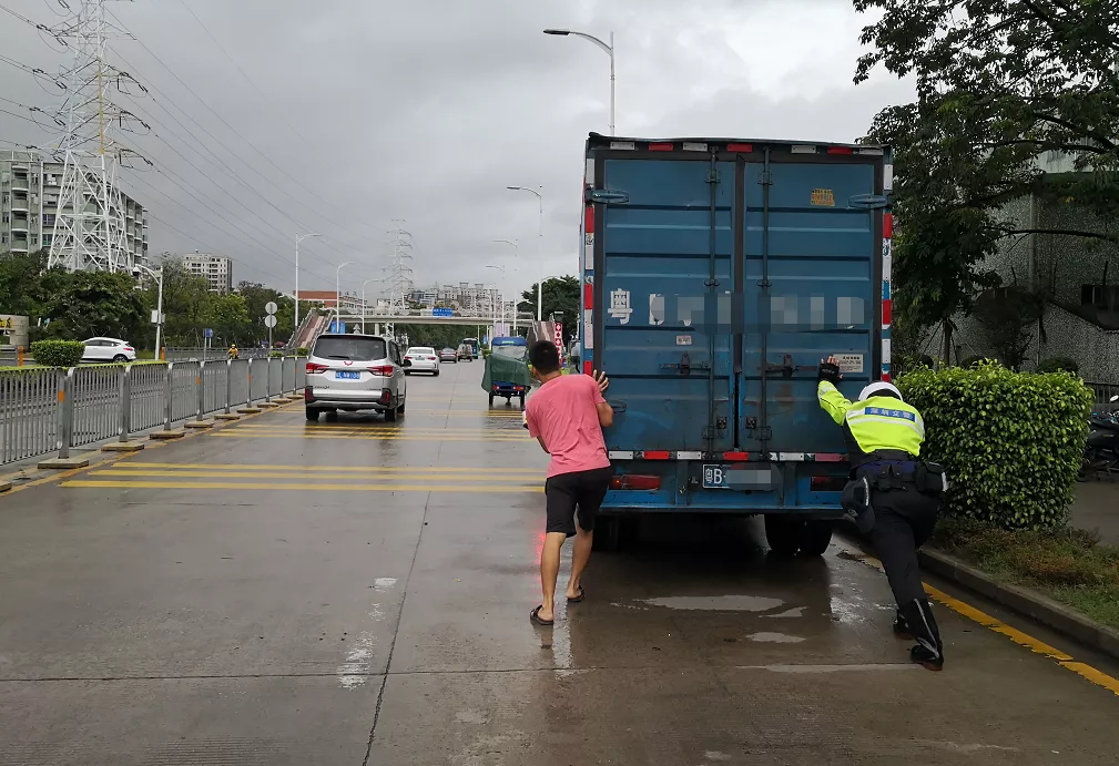 了解情况后,为缓解路面拥堵,避免产生交通事故,铁骑队员协助司机把车推到一边等待救援。