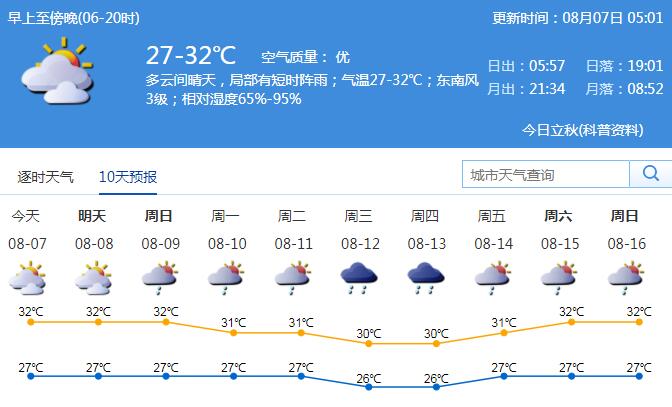 见圳客户端·深圳新闻网2020年8月7日讯 降雨暂缓,高温又卷土重来。8月7日白天,全市以多云天气为主,偶有短时阵雨,早晚最低气温在27℃左右,中午前后最高气温在32℃左右,渐趋闷热。市内维持2-3级东南风;空气湿度大,相对湿度65%-90%。