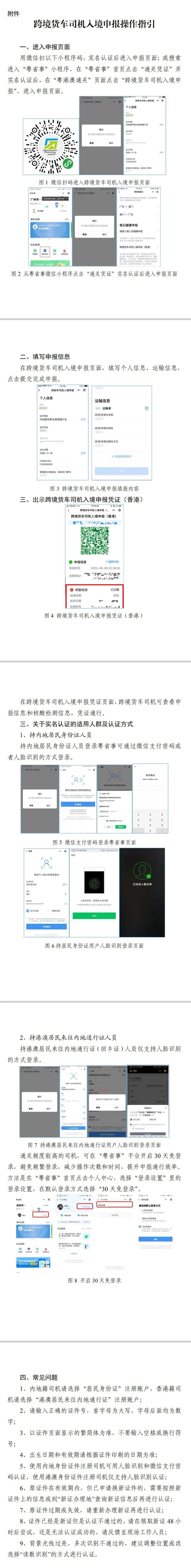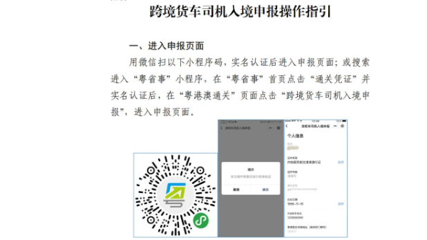 一、跨境司机入境前应在“粤省事”微信小程序(粤省事—粤康码—粤港澳通关—跨境货车司机入境申报)中准确申报运输作业任务相关信息,包括作业目的地详细信息(工厂/仓库名称及所在街道)、内地手机号码及相关个人信息,相关操作指引详见附件。入境后所申报手机号码将会接收提醒短信。未安装GPS定位系统和ETC电子不停车收费系统的入境货车,需按照相关部门安排前往指定场地免费安装GPS和ETC系统。