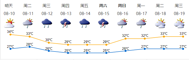周一至周二(10-11日)天气闷热,午后有分散雷阵雨,最高气温34-36℃;