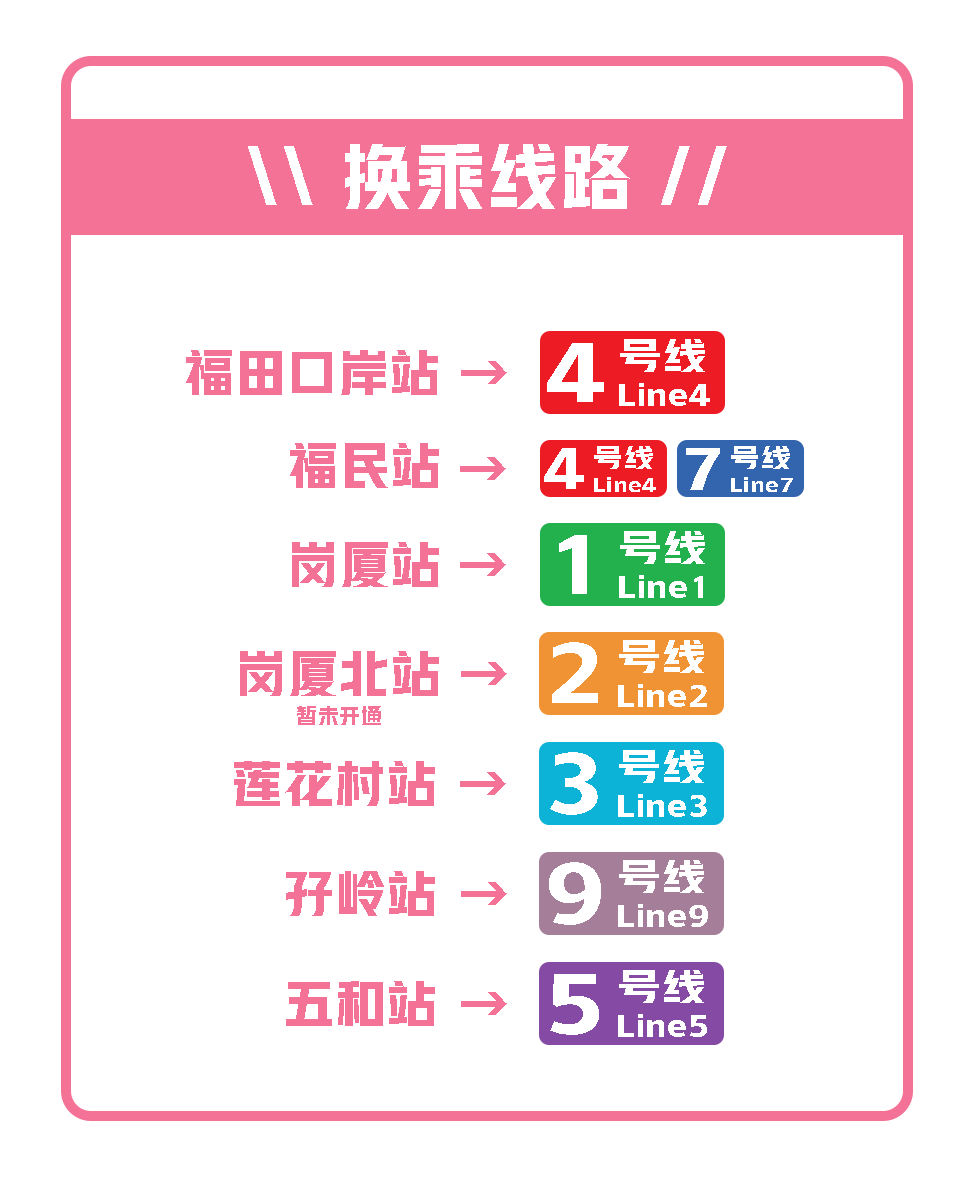 其中,B1口为既有3号线B1口;C2口接莲花二村小区及既有3号线C口(彩田路东侧);E口莲花山脚(彩田路西侧)、A2口接中银大厦北侧及既有3号线A口(红荔路南侧)。