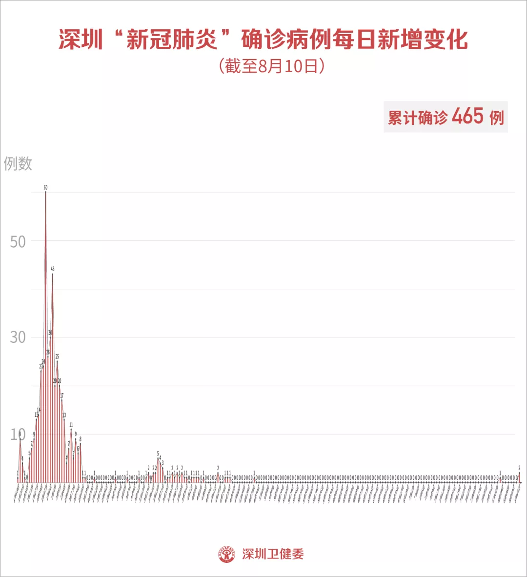截至8月10日24时,深圳市累计报告新冠肺炎确诊病例465例。目前在院3例。