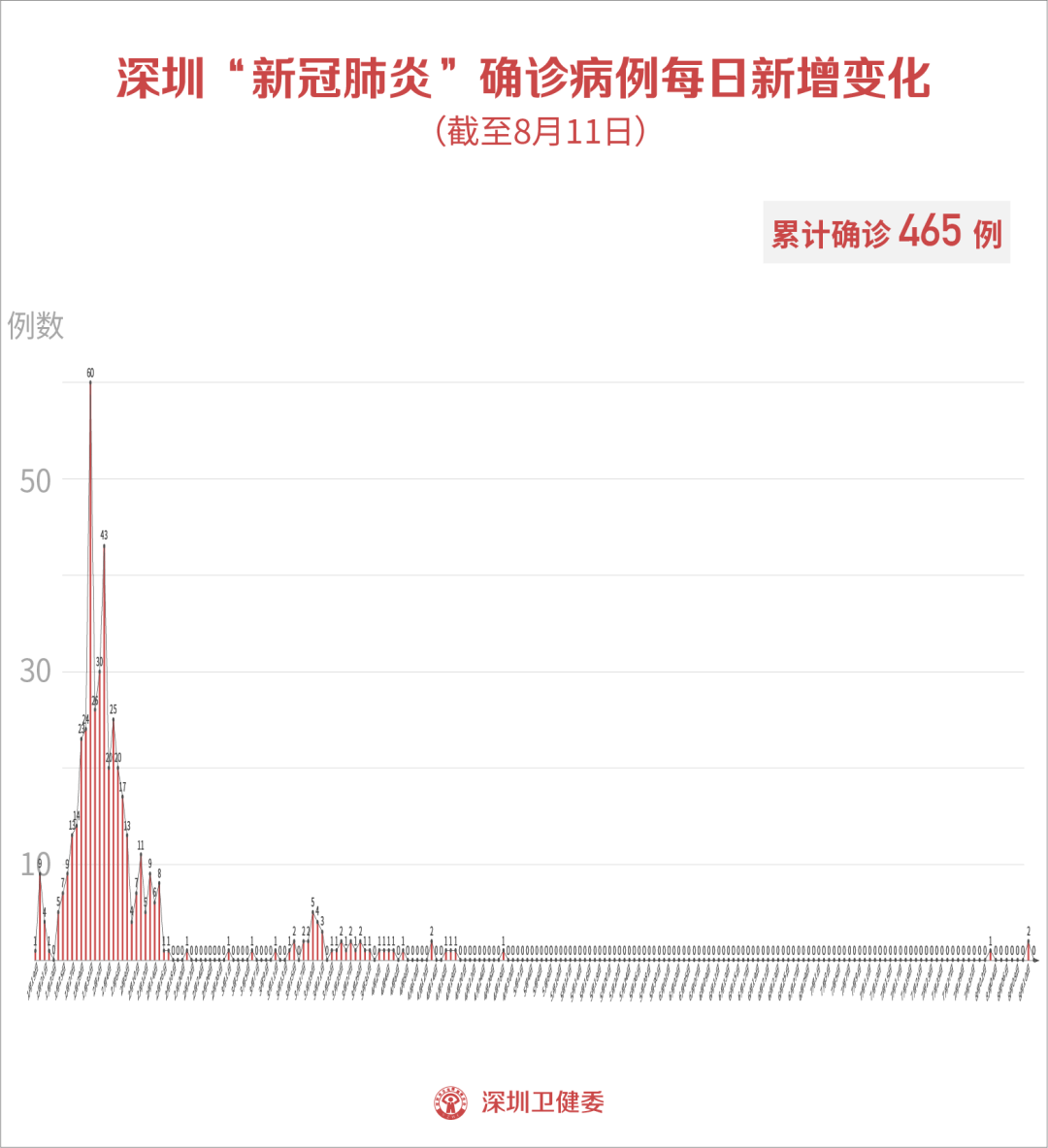 截至8月11日24时,深圳市累计报告新冠肺炎确诊病例465例。目前在院3例。