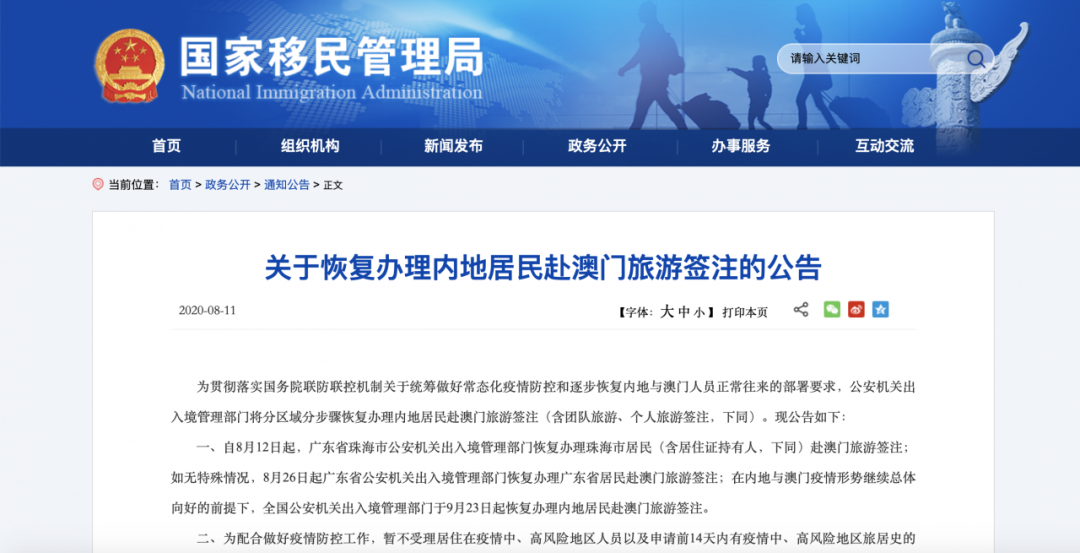 一、自8月12日起,广东省珠海市公安机关出入境管理部门恢复办理珠海市居民(含居住证持有人,下同)赴澳门旅游签注;如无特殊情况,8月26日起,广东省公安机关出入境管理部门恢复办理广东省居民赴澳门旅游签注;在内地与澳门疫情形势继续总体向好的前提下,全国公安机关出入境管理部门于9月23日起恢复办理内地居民赴澳门旅游签注。