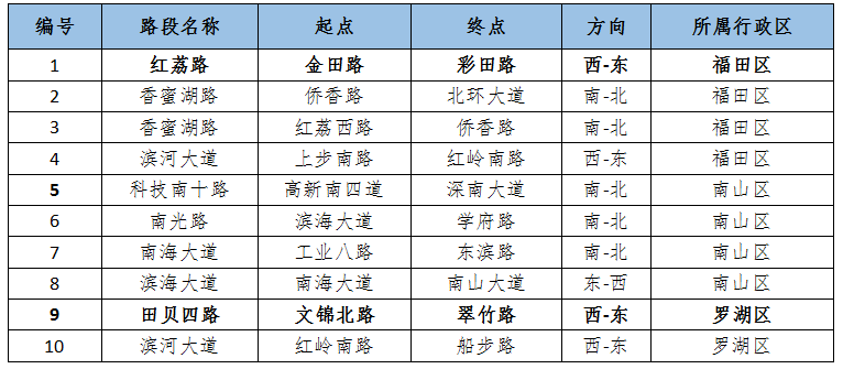 预计台风季工作日晚高峰时段十大易堵路段主要集中在福田、南山、罗湖区,其中,福田区红荔路(金田路-彩田路)、罗湖区田贝四路(文锦北路-翠竹路)等路段受降雨天气影响较大,预计晚高峰时段路段通行时长较普通工作日多花费30%-60%,道路运行有所恶化。