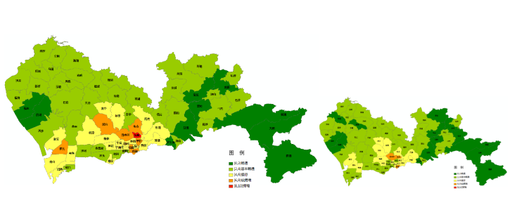 图2 预计台风季工作日(左)、普通工作日(右)早高峰全市主要街道交通运行状态图