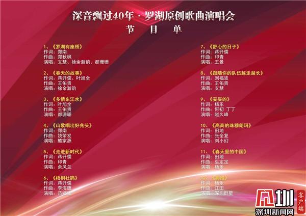 歌曲创作是深圳市罗湖区的强项,中国大陆的流行歌曲即由此发端。四十年来,《春天的故事》、《走进新时代》、《跟随你的队伍越走越长》、《山歌唱出好兆头》等一大批脍炙人口的罗湖原创歌曲,经由影视、广播等媒体传播,风靡大江南北,反映了时代剧变,表达了人民心声。此次演唱会,精选了其中的12首歌曲,由熊家源、余凤兰、刘小幻、范媛媛、杨乐、支慧、赵久峰、都园园、王景、徐余瀚韵等数位深圳歌唱家倾情演绎,其中既有创作于上世纪的歌曲,也有近年来新创作的歌曲,堪称一场声乐盛宴。