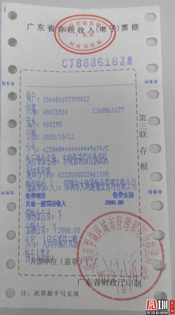 深圳新闻网讯 (见圳客户端、深圳新闻网 记者 彭桂红 通讯员 吴清庆)9月1日,《深圳市生活垃圾分类管理条例》正式实施,经过一个月的执法警示期,10月起,深圳垃圾分类进入集中执法阶段,对不开展垃圾分类等行为正式开罚。记者10月14日获悉,深圳市罗湖区东晓街道执法队10月12日,开出辖区首张物业罚单,对深圳市大地通物业管理有限公司因垃圾分类投放点和收集容器未保持整洁立案查处,作出罚款人民币2000元的行政处罚。行政处罚相对人已依法缴纳罚款。
