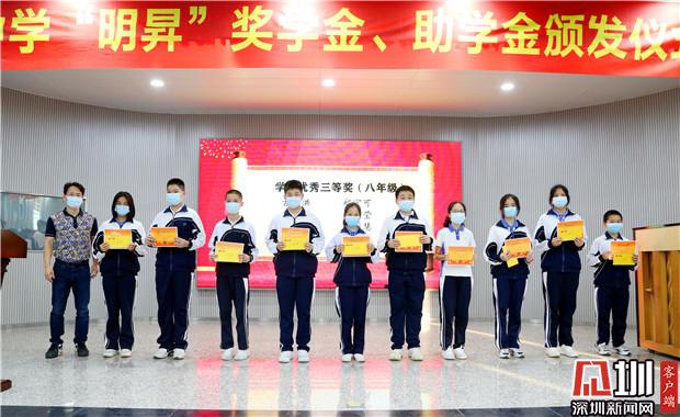 当天,144名学子及三个团队分别获得特长突出奖、学业进步奖、学业优秀奖一二三等奖等不同奖励。同时颁发的还有中考优秀奖、中考卓越奖、中考状元奖等奖项,由已毕业的布心学子家长返校代为领奖。当天还有4名老师受到表彰。2018年7月明昇集团为布心中学设立108万元奖学基金,每学期发放一次,奖励学业优秀、学业进步、特长突出的学生。本学期该奖学金第五次发放,到目前为止奖励学生近1000人次。从今年6月份开始,还增设了明昇助学金。