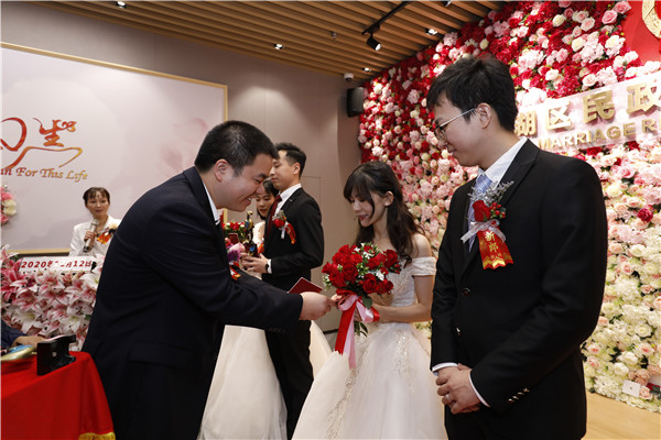 “我们是今年2月份在一起的,因为疫情的原因,让我们彼此更加知道‘珍惜眼前人’的含义,就像我在誓词中说的那样,未来我会用尽一生来爱她,我也会对她诚实,对她的家人尊重和照顾就像对我的家人一样,未来我们一定会健康地走下去。”在采访中,肖先生说道,选择在“双十二”结婚是因为今年是特别的一年,想在最后的一个月的双数日子里领证,留下美好的回忆。