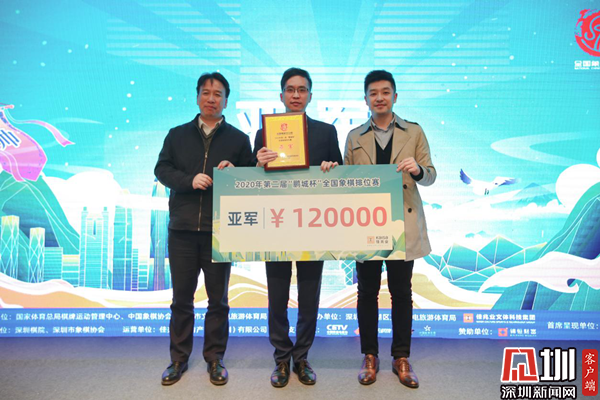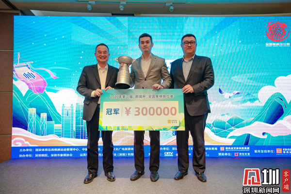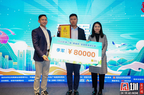 见圳客户端·深圳新闻网12月31日讯(记者 郭含笑)12月31日下午,由佳兆业呈现的第二届“鹏城杯”全国象棋排位赛在深圳市罗湖区阳光酒店举行颁奖仪式。王天一获得冠军以及30万元的奖金,赵鑫鑫、孟辰分别获得了亚军、季军。深圳市文化广电旅游体育局副巡视员王志强、体育产业发展处副处长李翊,深圳市罗湖区文化广电旅游体育局局长薛江,深圳棋院院长刘适兰,佳兆业集团董事局副主席兼总裁麦帆,佳兆业文体科技集团主席兼总裁舒立、副总裁郑威,佳兆业体育产业(深圳)有限公司总经理马恺,中国象棋协会竞赛主管李淼,腾讯文化与内容公共事务高级政务经理张嘉豪,深圳市象棋协会会长曹阳,以及裁判长、参赛棋手等嘉宾共同出席闭幕仪式。