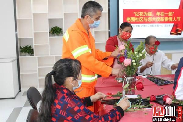 见圳客户端·深圳新闻网2月17日讯(记者 刘嘉敏 通讯员 杨纪欧)2月14日是大年初三,恰逢情人节,深圳市罗湖区桂园街道老围社区邀请企业员工、环卫工人、困难家庭、退休老人等五对夫妻代表到社区插花。五对夫妻以花为媒,互诉衷肠,表达爱的心声,与社工一起共度一个又温馨又浪漫的节日。老围社区党委书记许少琼给五对夫妻拜年,向他们一直以来对社区工作的支持表示感谢,尤其感谢他们在这个特殊的春节,留在深圳过节,并坚守岗位,服务更多人。同时,许少琼祝五对夫妻家庭幸福,感情甜蜜,生活顺心如意。