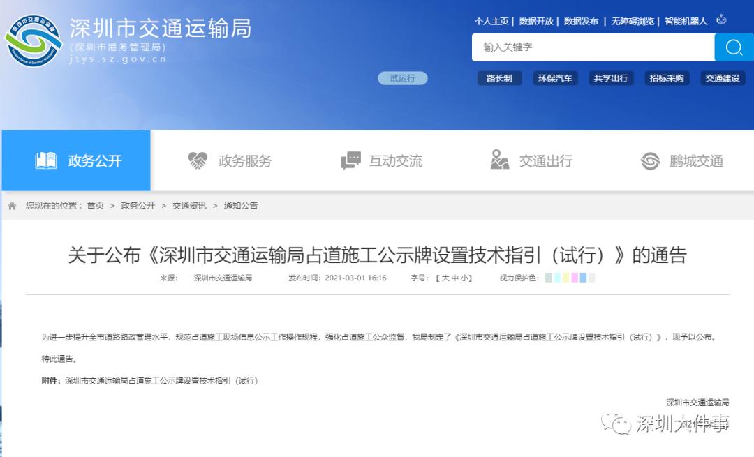 为加强道路管理,规范道路占用、挖掘行为,强化占道施工公众监督,深圳市交通运输局编制了《占道施工公示牌设置技术指引(试行)》(以下简称《指引》),对占道施工公示牌设置要求,张贴范围都有了明确的标准和要求。