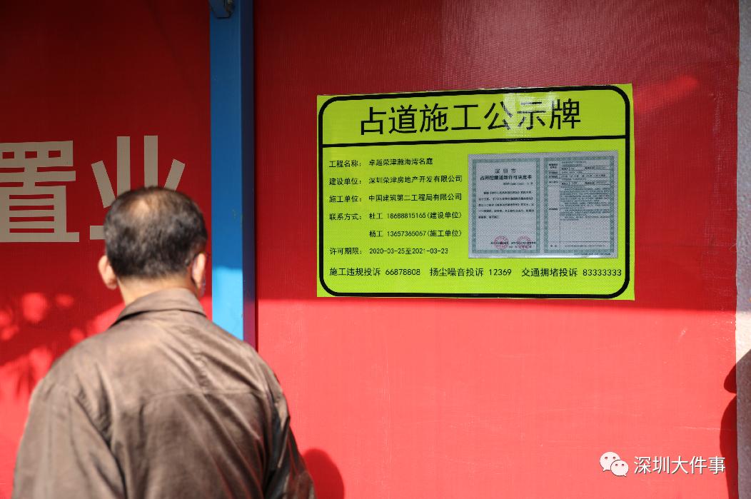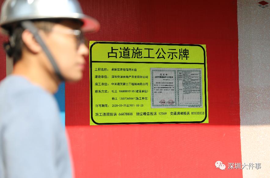 3月9日,我们在盐田区卓越荣津瀚海湾名庭施工现场看到,围栏外每隔50米就张贴了最新版的占道施工公示牌,且在便于行人查阅的显眼位置。